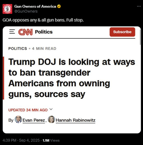 However, The Washington Post ran a story earlier this year talking about how there are, apparently, a number of transgender Americans purchasing guns in fear they may need to use them for protection because they are being marginalized by the Trump administration and society.