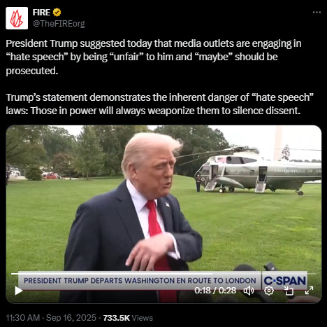 “Hate speech that crosses the line into threats of violence is NOT protected by the First Amendment. It’s a crime. For far too long, we’ve watched the radical left normalize threats, call for assassinations, and cheer on political violence. That era is over.